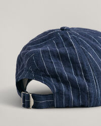 Stai sempre al fresco e all'ombra con questo classico cappellino realizzato in 100% lino e fantasia a righe. Progettato con una struttura bassa a sei pannelli, è dotato di cinturino regolabile e fibbia GANT incisa sul retro.