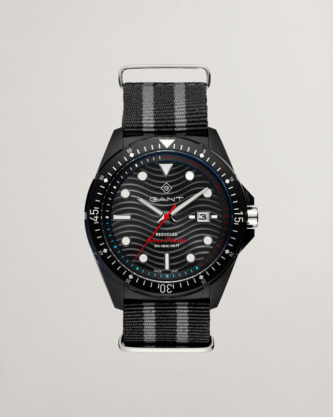 La collezione di orologi da uomo classici e sportivi di GANT unisce innovazione e maestria artigianale per creare momenti ispirati al nostro credo: “Never Stop Learning”. R.O.P è un orologio da polso prodotto con la plastica riciclata recuperata dal mare, con cinturino Nato. Tre lancette e datario.